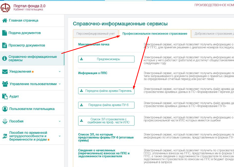 3) В пункте меню "Справочно-информационные сервисы" выбрать вкладку "Профессиональное пенсионное страхование"